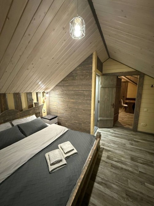 Двоповерховий котедж площею 90 м², розрахований на 4 осіб. Формат підходить для сім’ї або невеликої компанії, які хочуть відпочивати без перетину з іншими гостями.
