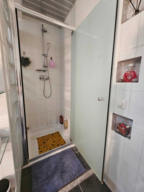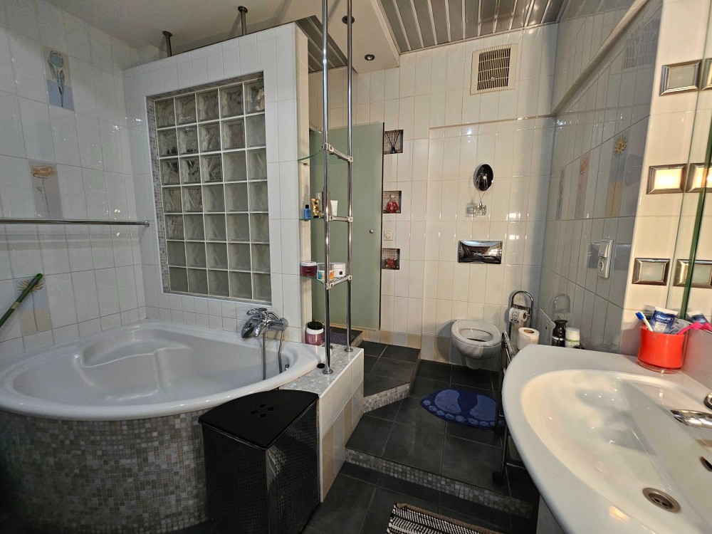Санузел облицован плиткой (стены и пол), установлены угловая ванна и душевая кабина, сантехника в хорошем состоянии.