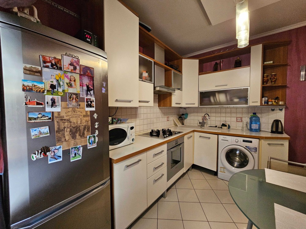 На кухне установлена встроенная мебель и бытовая техника: варочная панель, духовой шкаф, стиральная машина и двухкамерный холодильник.