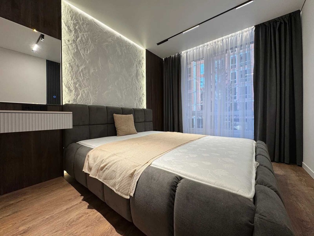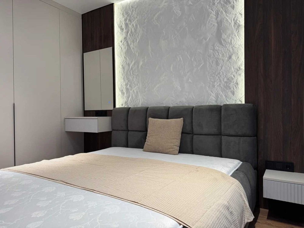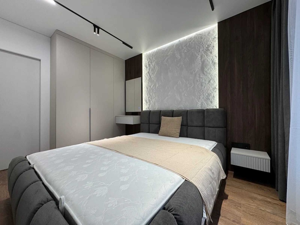- Спальня укомплектована двоспальним ліжком з підйомним механізмом, приліжковими тумбами та передбаченим місцем для телевізора.