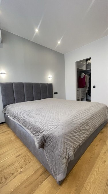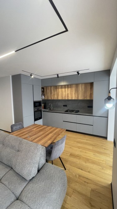 Квартира виконана у сучасному стилі з використанням дорогих матеріалів. Продумане планування: кухня-студія, дві окремі кімнати, гардеробна, дві лоджії.