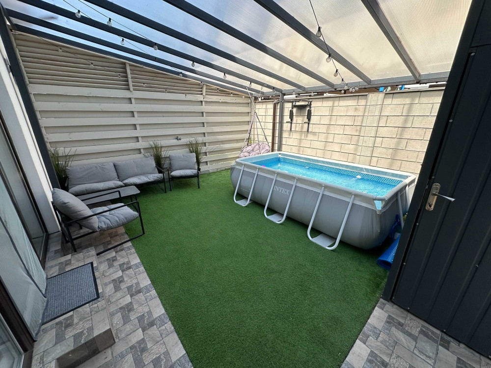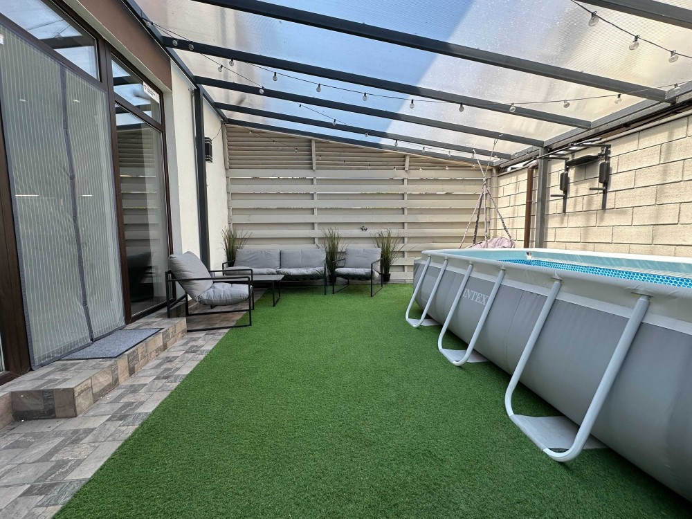 кухня-гостиная с выходом на задний двор с бассейном и кладовой.