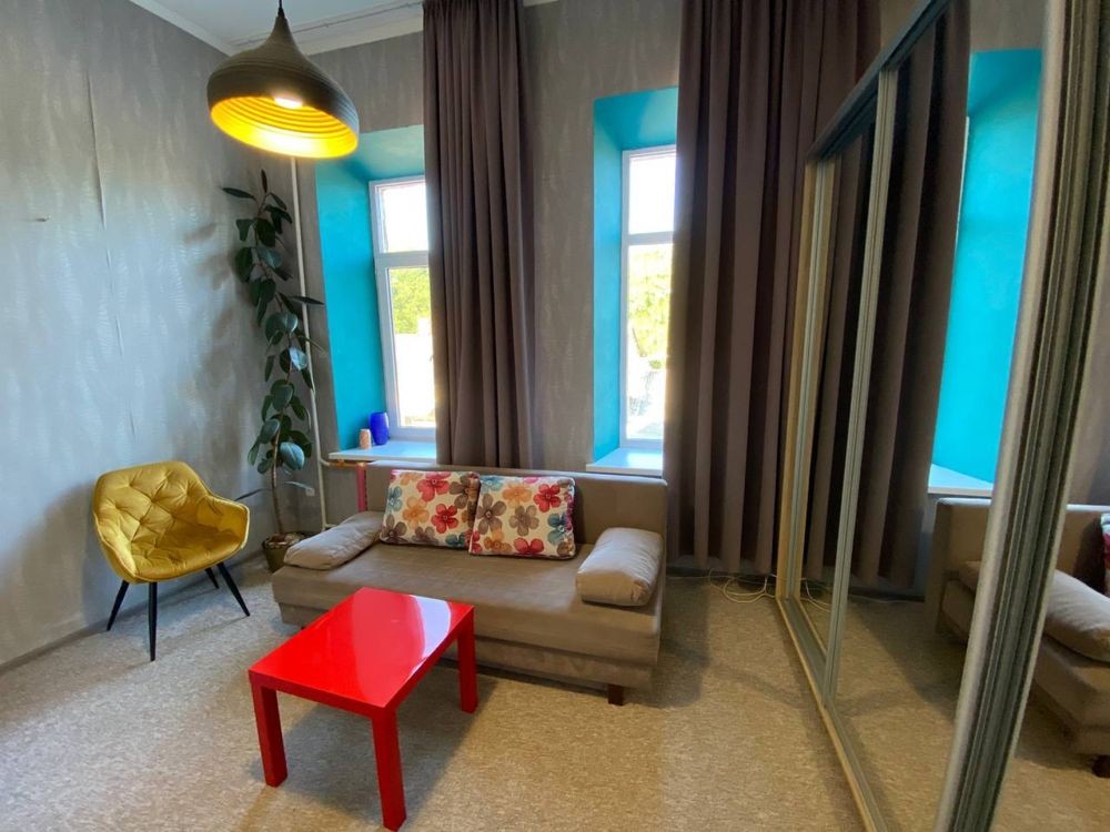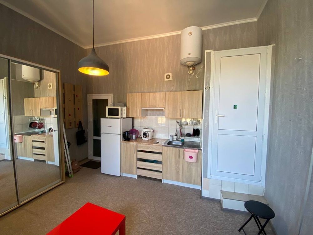 Cтудія в чудовому стані з власною кухнею та душем, кондиціонером, двома великими вікнами та подвійними дверима (запахи з загальної кухні не потрапляють, хороша шумоізоляція).