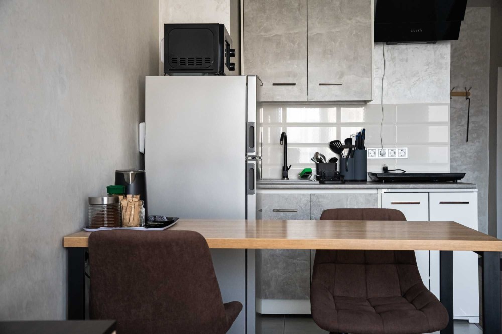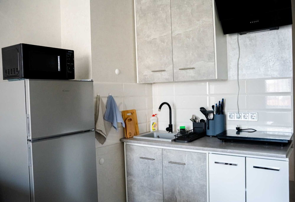 • Кухня с техникой: плита, микроволновка, холодильник