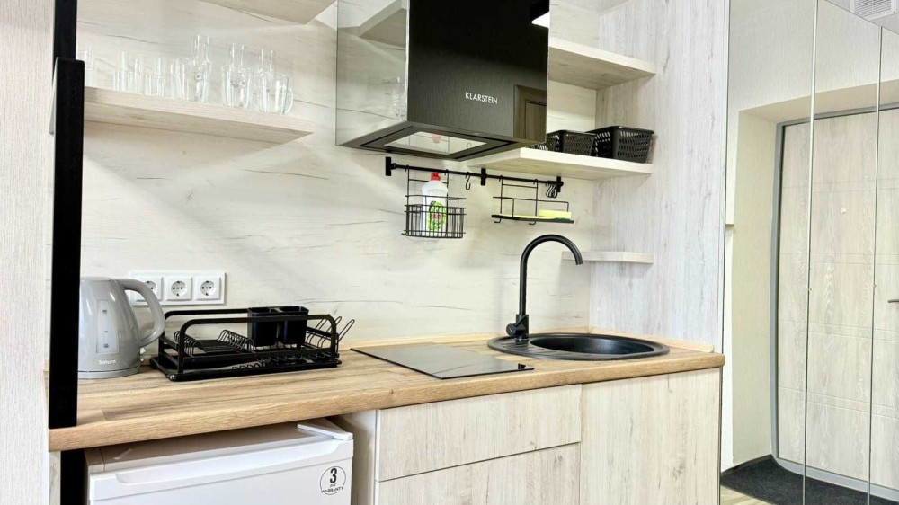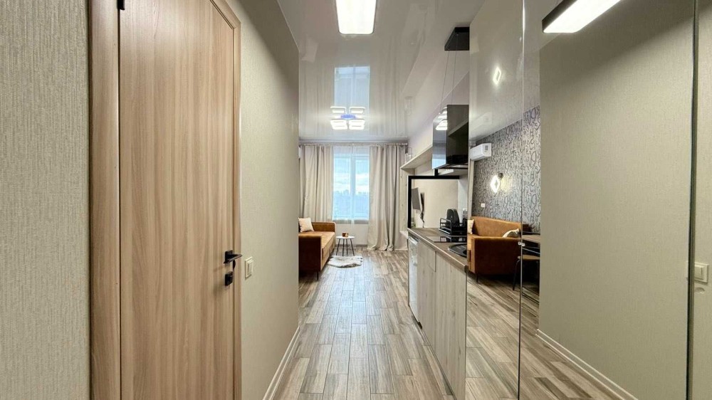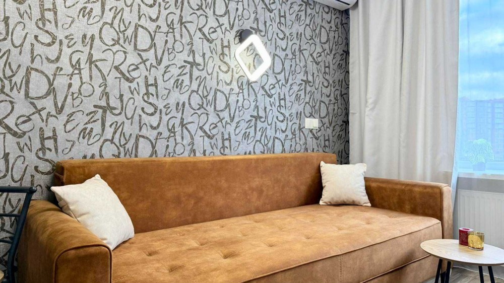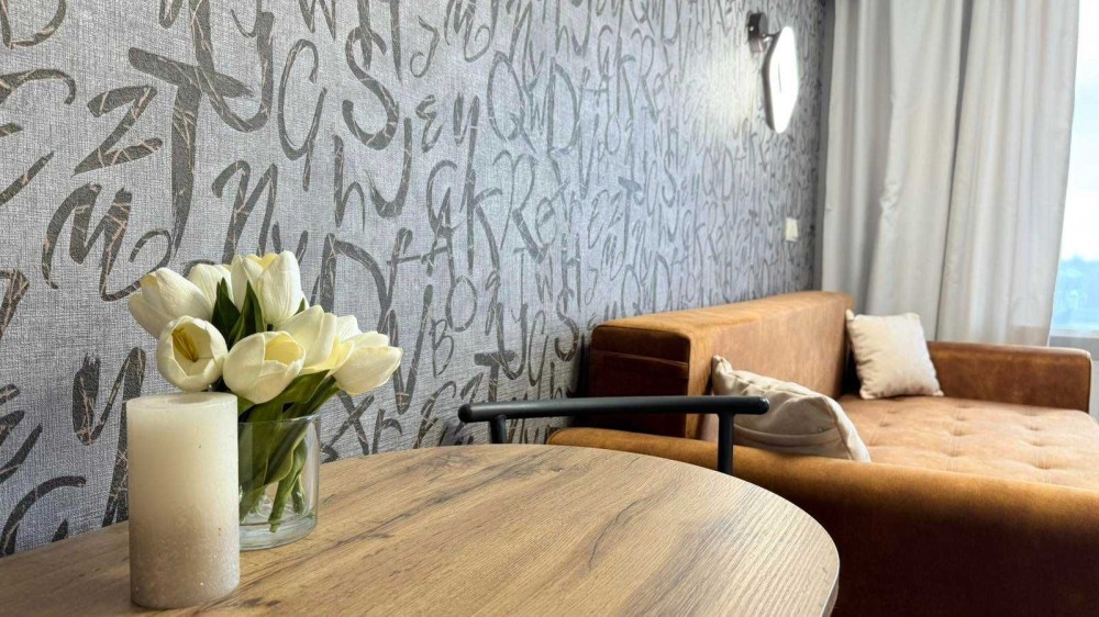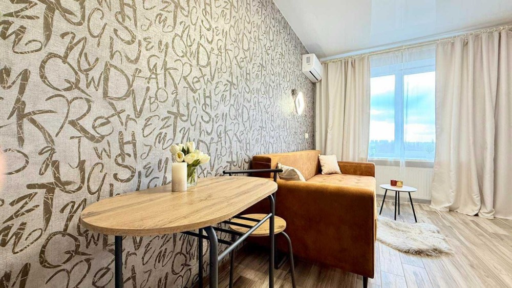 Інтер’єр виконаний у сучасному європейському стилі: тепле освітлення, фактурні шпалери, ергономічні меблі та приємні натуральні матеріали створюють атмосферу домашнього комфорту. Квартира продумана до дрібниць, щоб кожен гість почувався максимально затишно.