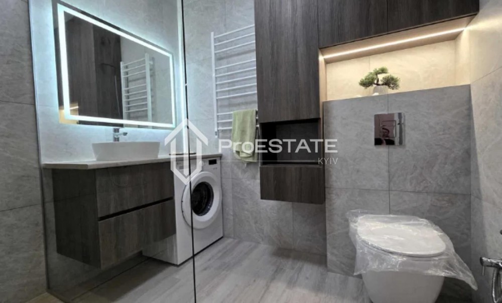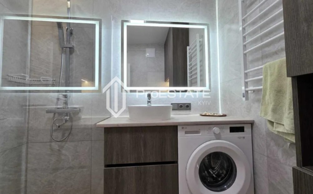 У квартирі екологічні стелі: у житлових кімнатах — штукатурка та фарбування, у кухні й передпокої — гіпсокартон, у санвузлі — натяжна стеля. Встановлені двозонні лічильники електроенергії, лічильники води та тепла, фільтр і редуктор тиску води, тепла підлога у двох зонах. Квартира обладнана кондиціонером, індукційною варильною поверхнею, холодильником та пральною машиною з інверторним двигуном. Душова зона з трапом. Передбачено багато місць для зберігання — три місткі вбудовані шафи.