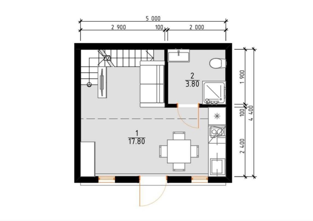 • 1 поверх – кухня-вітальня та санвузол;