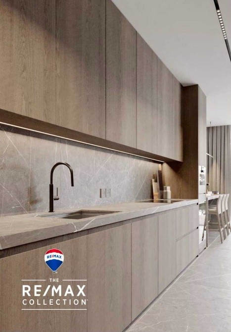 кухня RAIT виконана з натурального шпону (дуб), робоча поверхня та барна стійка з натурального каменю, укомплектована технікою Mielle;
