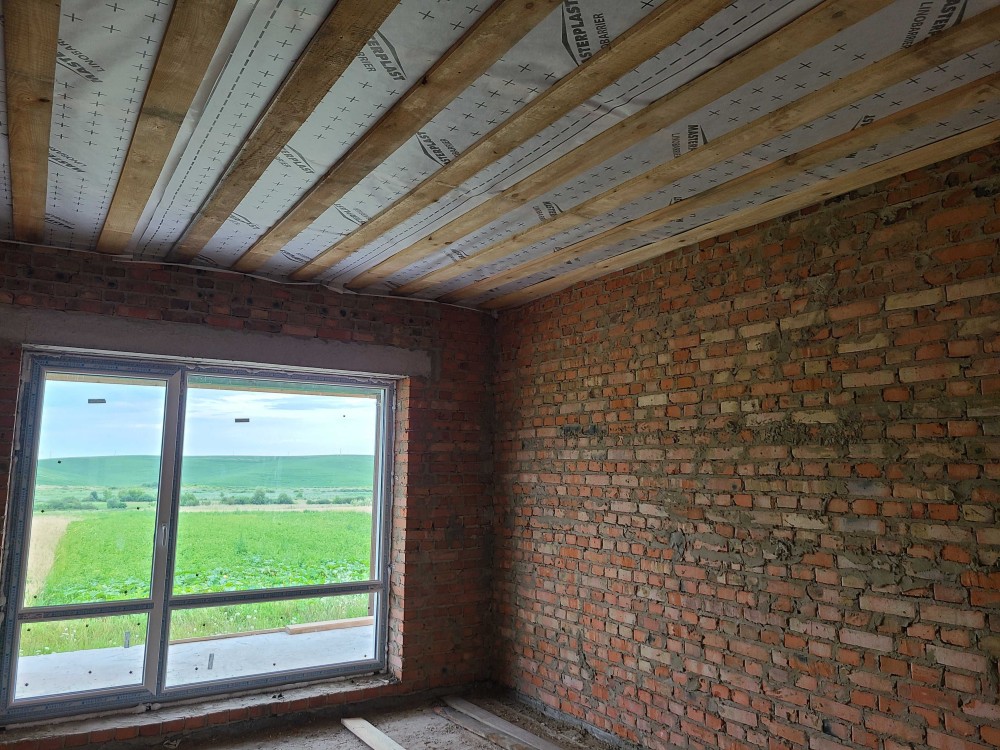 Збудований в півтори цеглини на палевому фундаменті (монолітні сваї), армована плита підлоги, утеплений фасад (10см п/п), змонтований дах з можливістю використання мансарди. Встановлені якісні енергозберігаючі вікна (в максимальній комплектації) та протизламні добротні двері, підшите міжповерхове перекриття. Металева суцільна водостічна система.