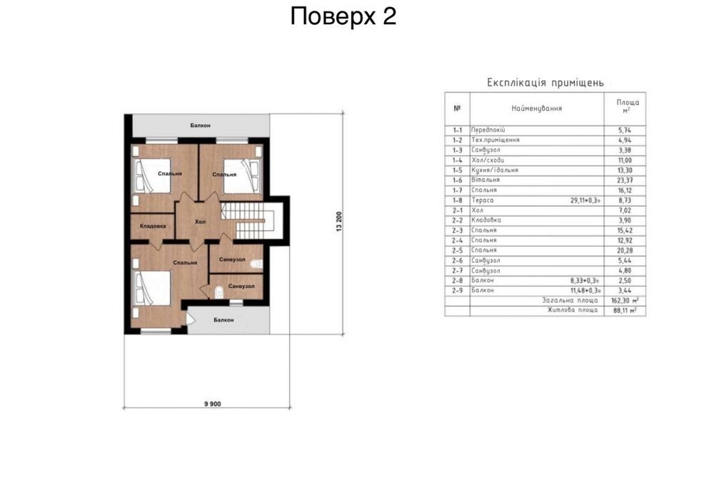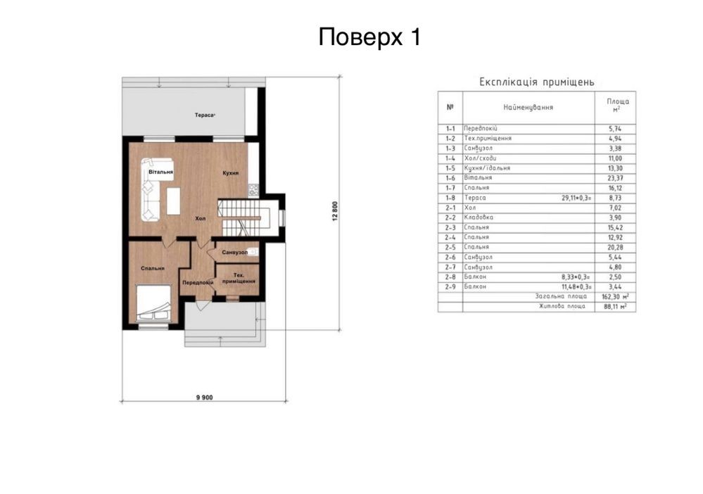 Загальна площа будинку 162м2