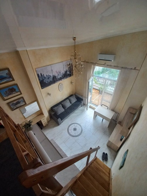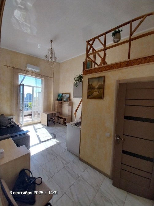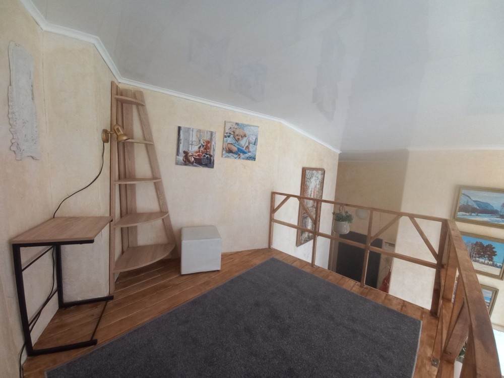 В квартире есть второй уровень, где оборудовано рабочее место или место для отдыха.