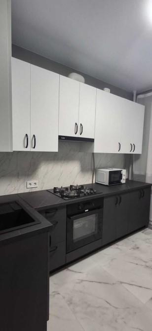 Кухня обладнана вбудованими меблями, газовою плитою, духовою шафою, мікрохвильовою піччю та зручною обідньою зоною. Усе продумано для комфортного щоденного користування.