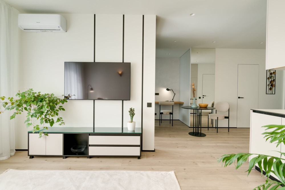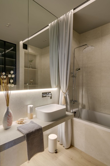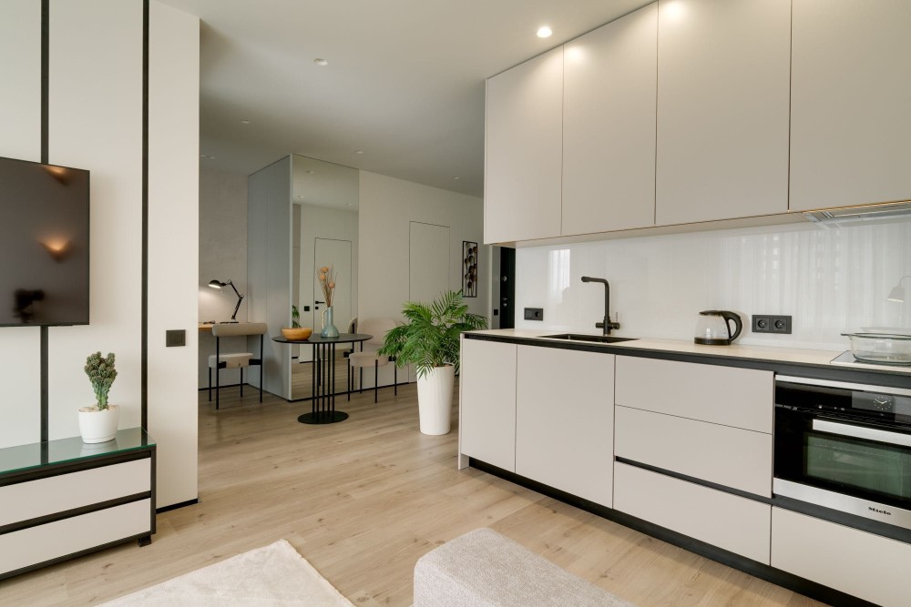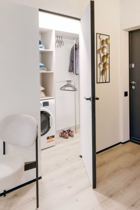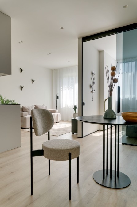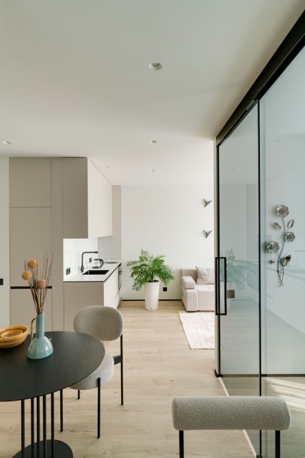 Квартира має відкрите планування з вітальнею, кухнею та обідньою зоною, а також зручний робочий куточок. Спальня відокремлена стильними скляними розсувними перегородками з чорними рамами. Простора ванна кімната з ванною та дощовим душем доповнена підігрівом підлоги. Окрема гардеробна виконує функції пральні, схову та утиліті-зони.