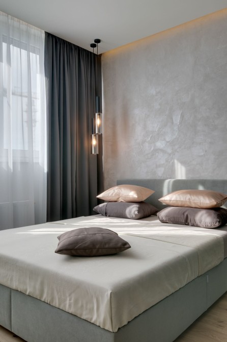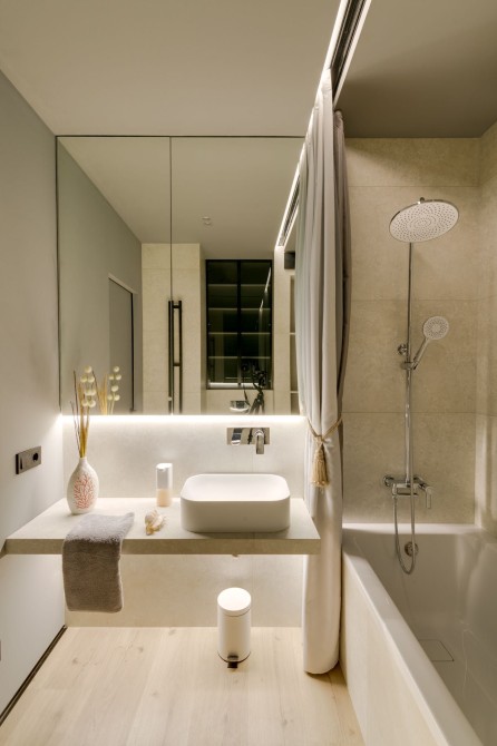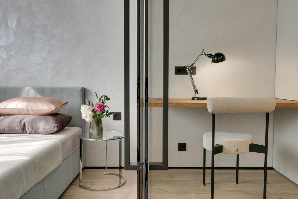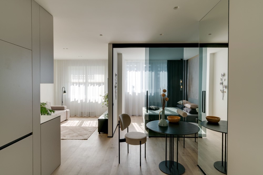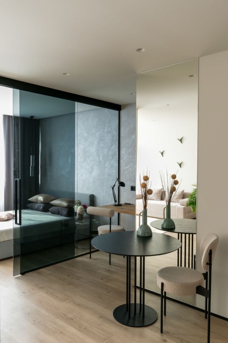 Інтер’єр вирізняється світлою палітрою з акцентами чорного металу й теплом дерева. Скляні поверхні, дзеркала та м’який текстиль додають відчуття простору та легкості.