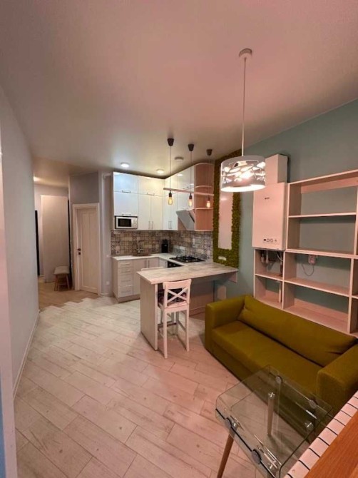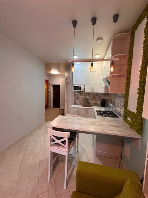 - Кухня: диван розкладний низький 110*200, мікрохвильова піч, чайник, газова плита, електродуховка, посуд (можна використовувати за потреби), барна стійка на 2 стільця. Стіна з живого стабілізованого моху, декоративна, догляду не потребує.