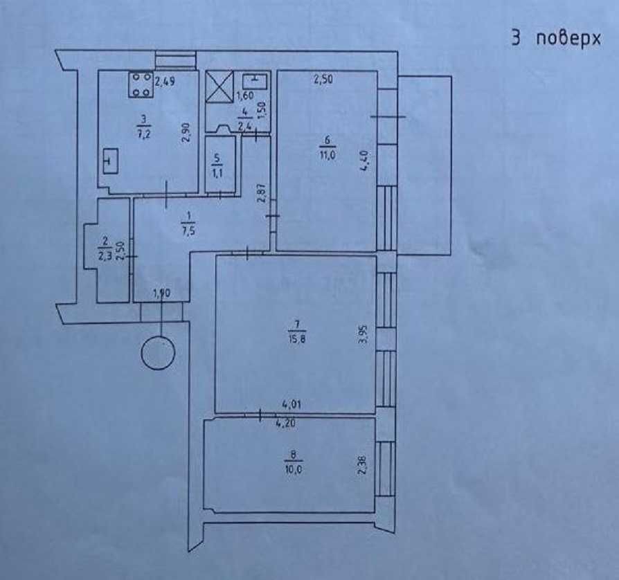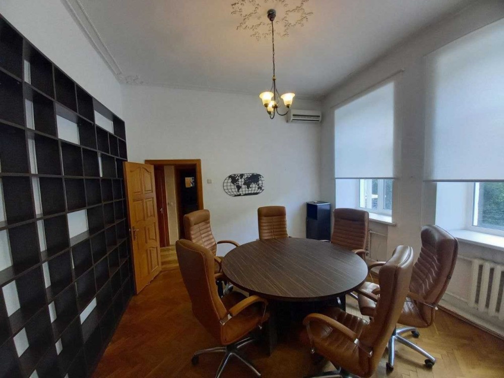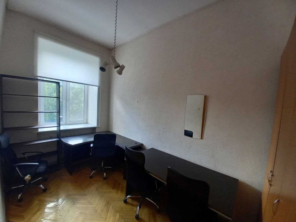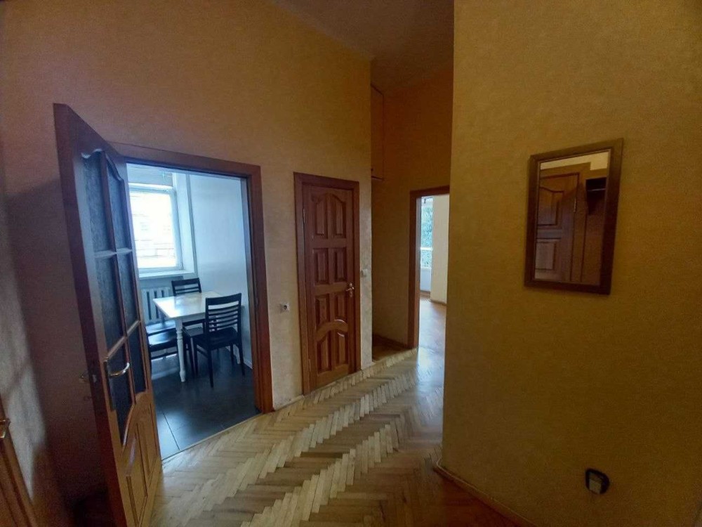 Планування: дві окремі кімнати 10 та 11кв.м, велика прохідна зала 15,8 кв.м, кухня 7,2 кв.м, роздільний санвузол з душовою кабіною, комора, великий відкритий балкон з видом на вулицю Володимирську.