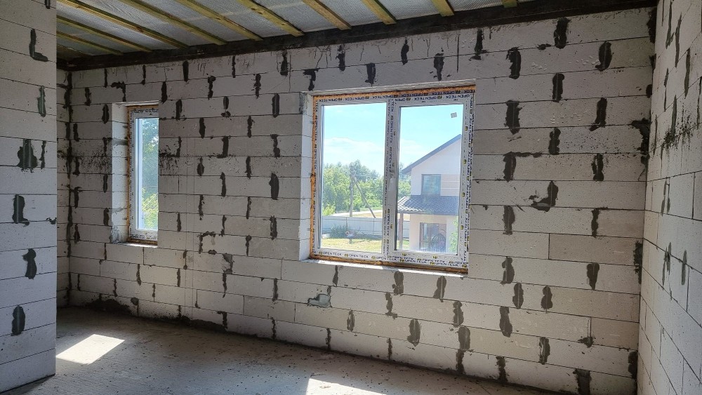 Стіни з газоблоку Стоунлайт товщиною З0 см утеплені 10-сантиметровим пінопластом. Зблокована стіна товщиною 40 см.