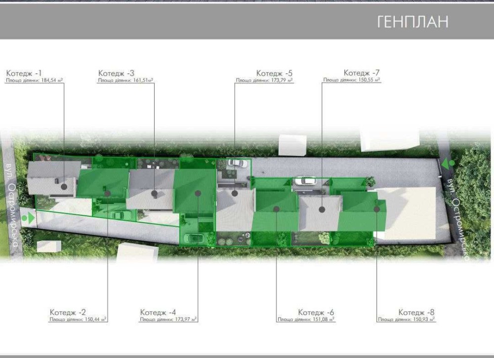 Передній дворик спільний на чотири будинки, викладений бруківкою, з передбаченими паркомісцями для кожного. Задній дворик – індивідуальний: бруківка, зелена зона, є вивід для поливу, вентиляційний канал під камін або барбекю.