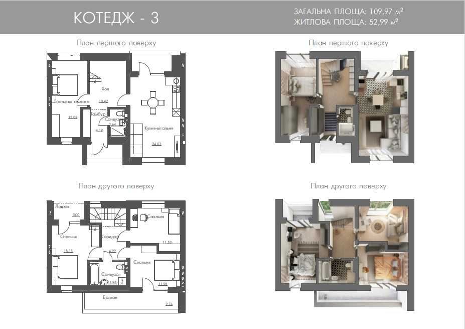 На першому поверсі – велика кухня-вітальня з виходом на терасу, де приємно пити каву або проводити вечори з родиною. Є також гостьова кімната. На другому поверсі – три окремі спальні та великий балкон.