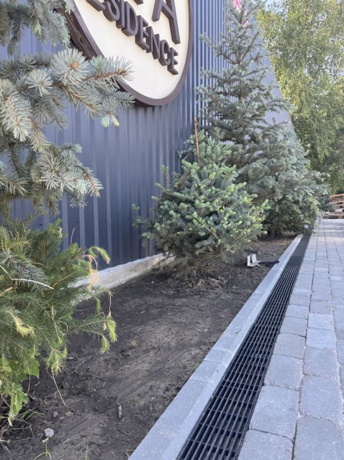 Прибудинкова територія з бруківки, туї на території.
