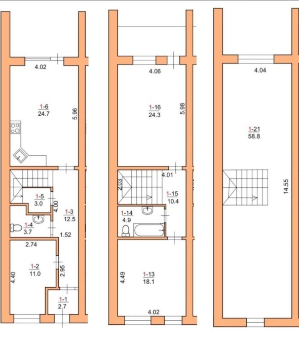 Таунхаус площею 120 - 174 м2, має 2 та 3 поверхи, 5 окремих кімнат. Є газ.