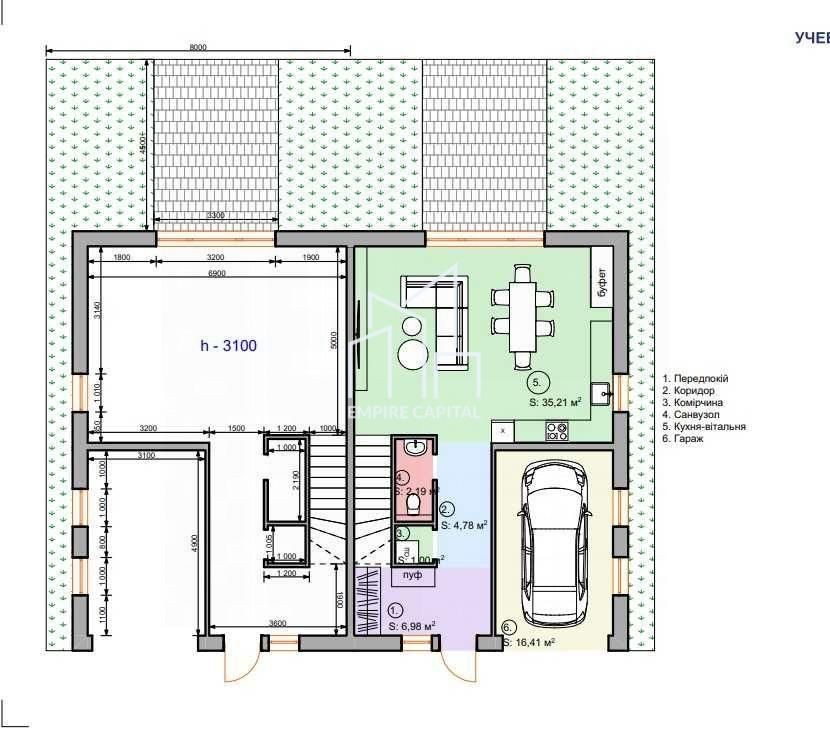 – 1-й поверх: передпокій, санвузол, комірчина, кухня-студія з виходом на терасу, панорамні вікна Rehau