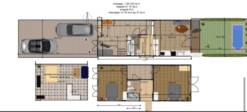 Третий этаж мансардный , свободной планировки.