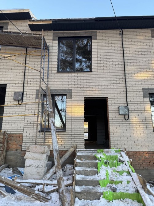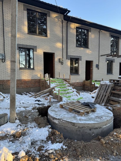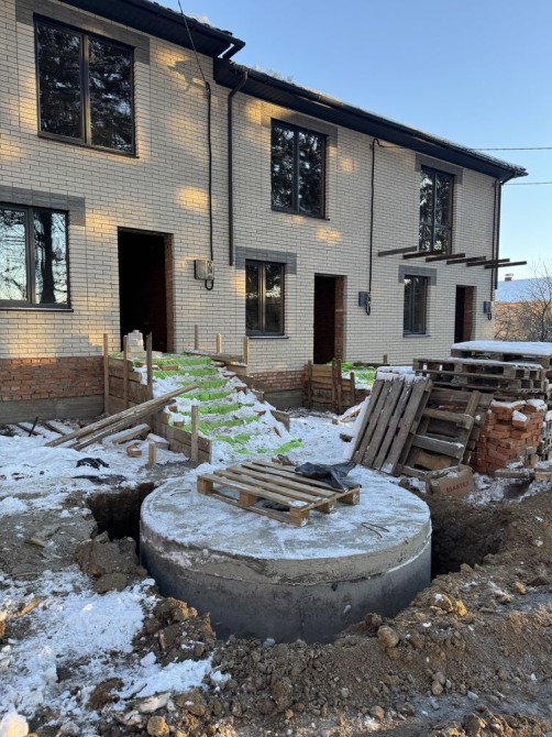 Таунхаус загальною площею 82 м2, земельна ділянка перед будинком та позаду, три кімнати, кухня-вітальня, два санвузла! Утеплення мінеральна вата, стеля також буде утеплена! По комунікаціям вигрібна яма, світло 11 кВт, свердловина!
