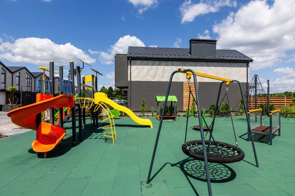 На території містечка бассейн, дитячий майданчик та майданчик для дорослих.