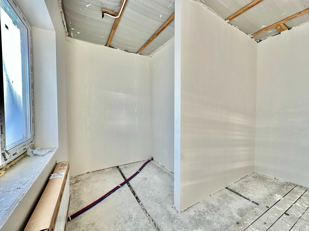 + стіни - чистова штукатурка з використанням склополотна для міцності і запобігання тріщин, також зроблена шумоізоляція;