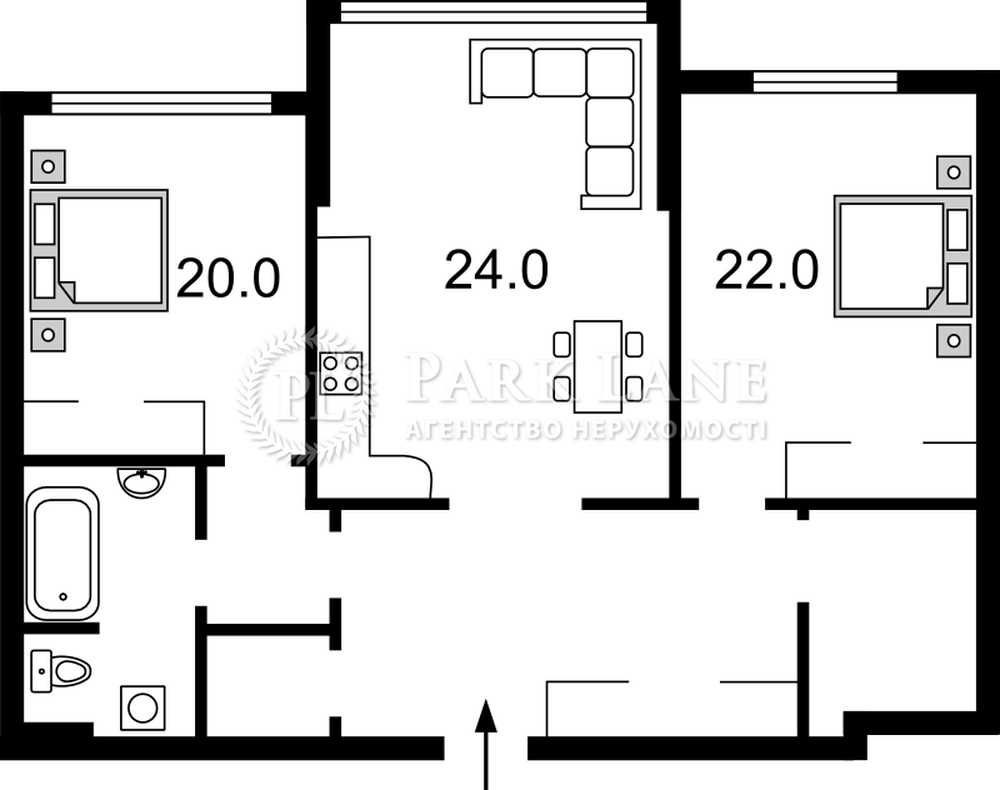 Планування: дві окремі кімнати, простора кухня-вітальня, 26 м2, хол, два санвузла (ванна і душова).