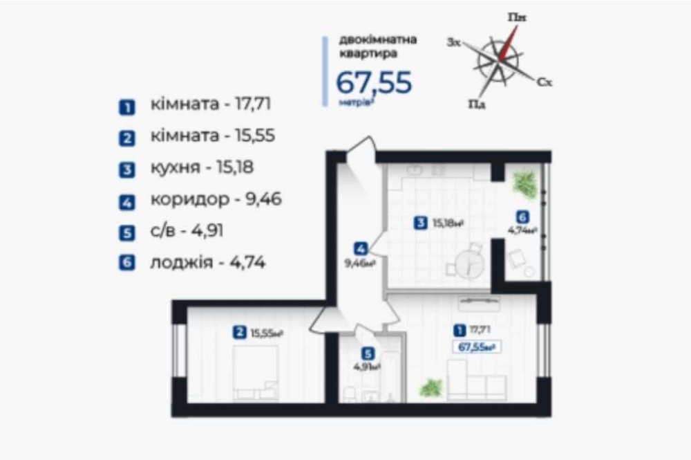 • Загальна площа 69.6 м2