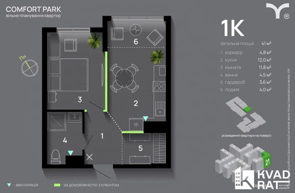 Пропонується до продажу однокімнатна квартира загальною площею 40.6 м у сучасному житловому комплексі «Комфорт Парк».