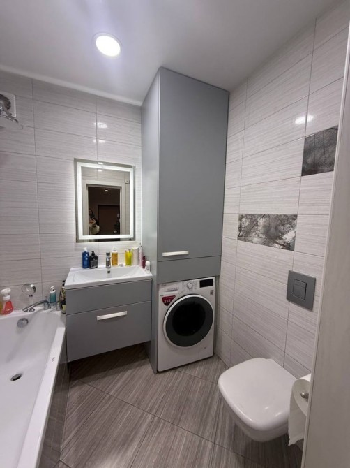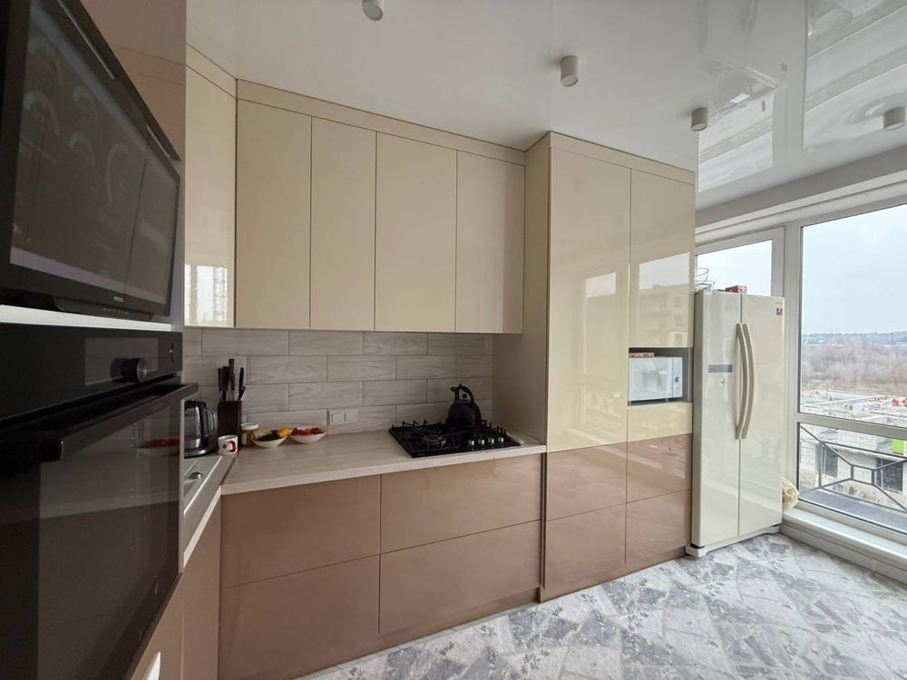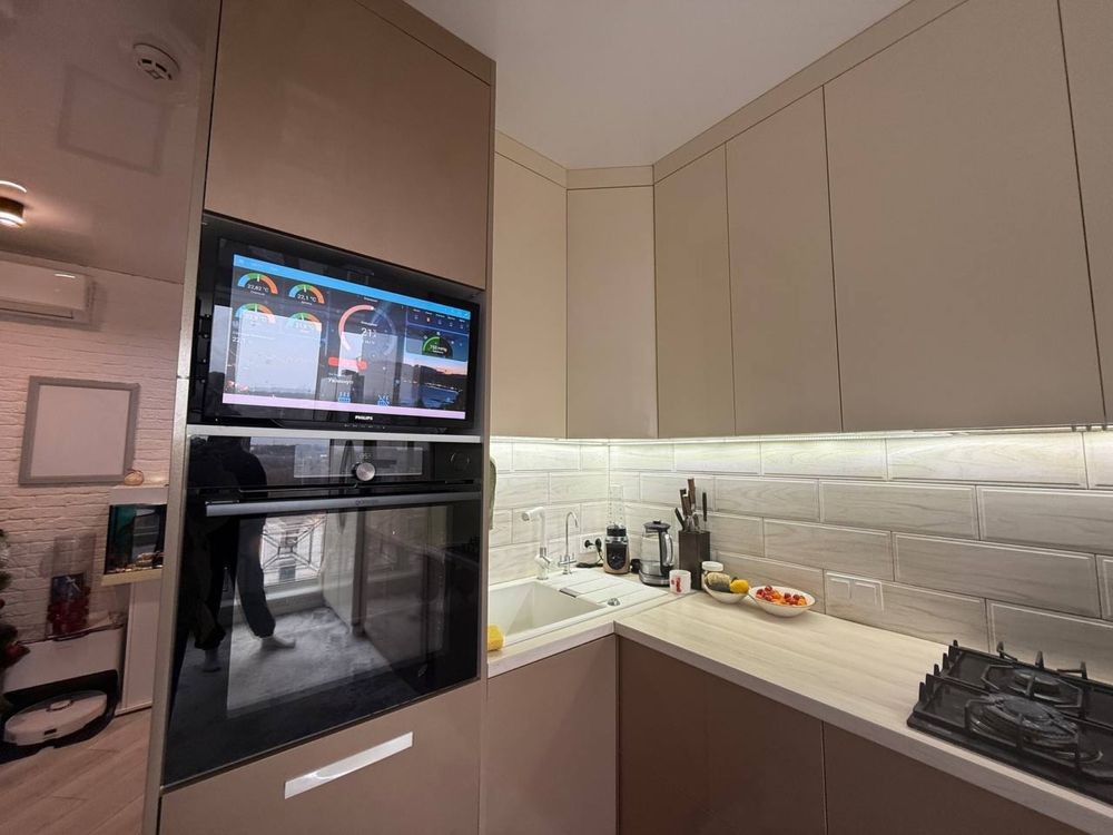 Комплекс закритого типу. Світла квартира, в зоні передпокою встановлена шафа та велике дзеркало. Кухня 12м2,Меблі виконані з мдф ,під замовлення. Круглий стіл, посудомийка 60см,холодильник двох дверний.