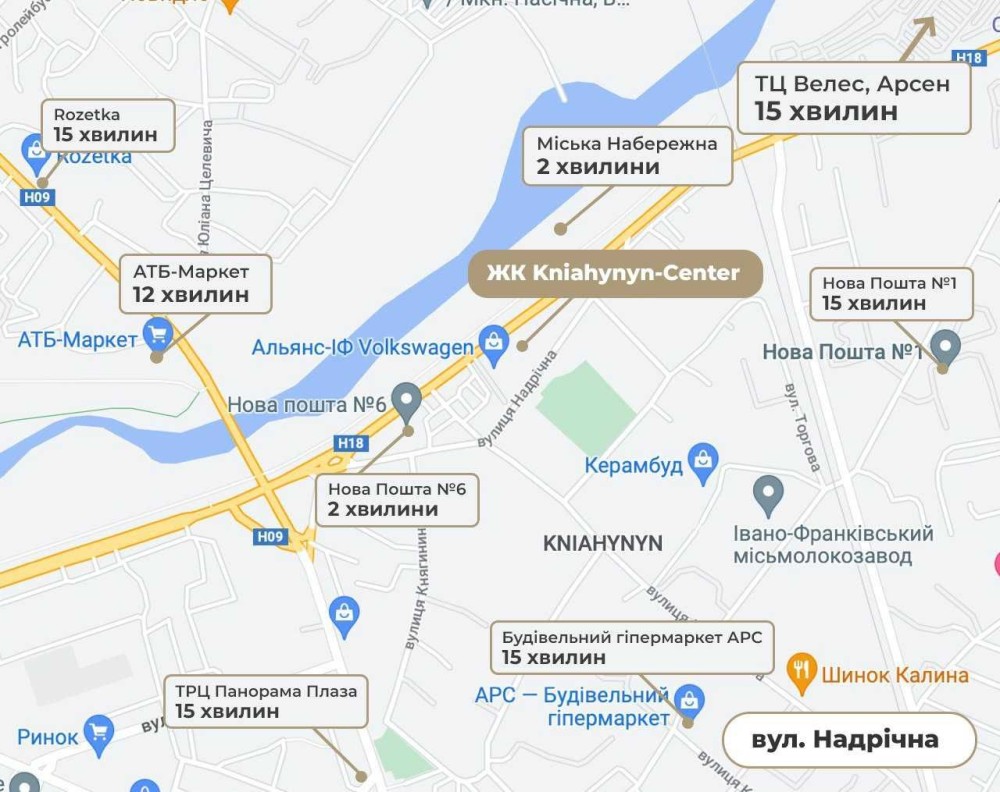 ЖК KNIAHYNYN-CENTER має ідеальну транспортну розв’язку, адже знаходиться поруч з новим «Галицьким» мостом (вул. Надрічна).