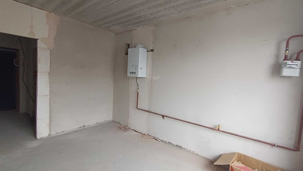 Встановлен газовий котел, лічильники, зроблена чистове оздоблення несучих стін, лазерна стяжка підлоги.