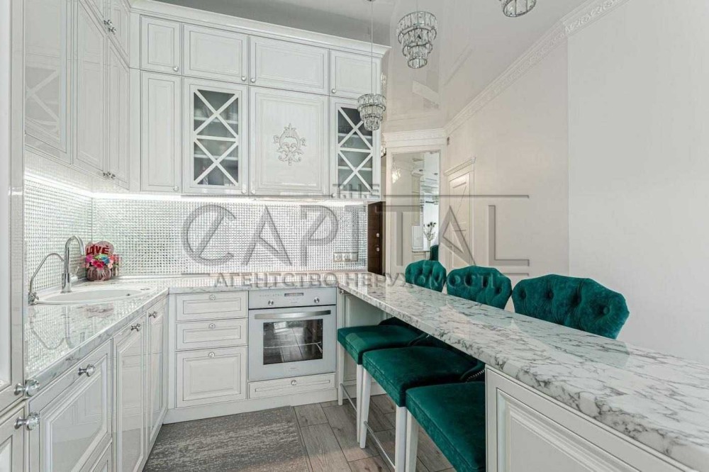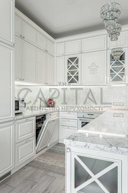 Кухня укомплектована меблями із дерева преміального виробника, та технікою - духова шафа, індукціонна плита, система очищення води (осмос), встановлено блок подрібнення харчових відходів, холодильник, посудомийна машина.