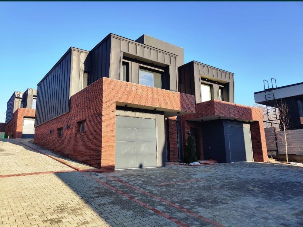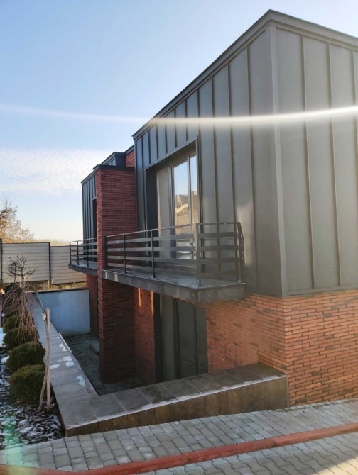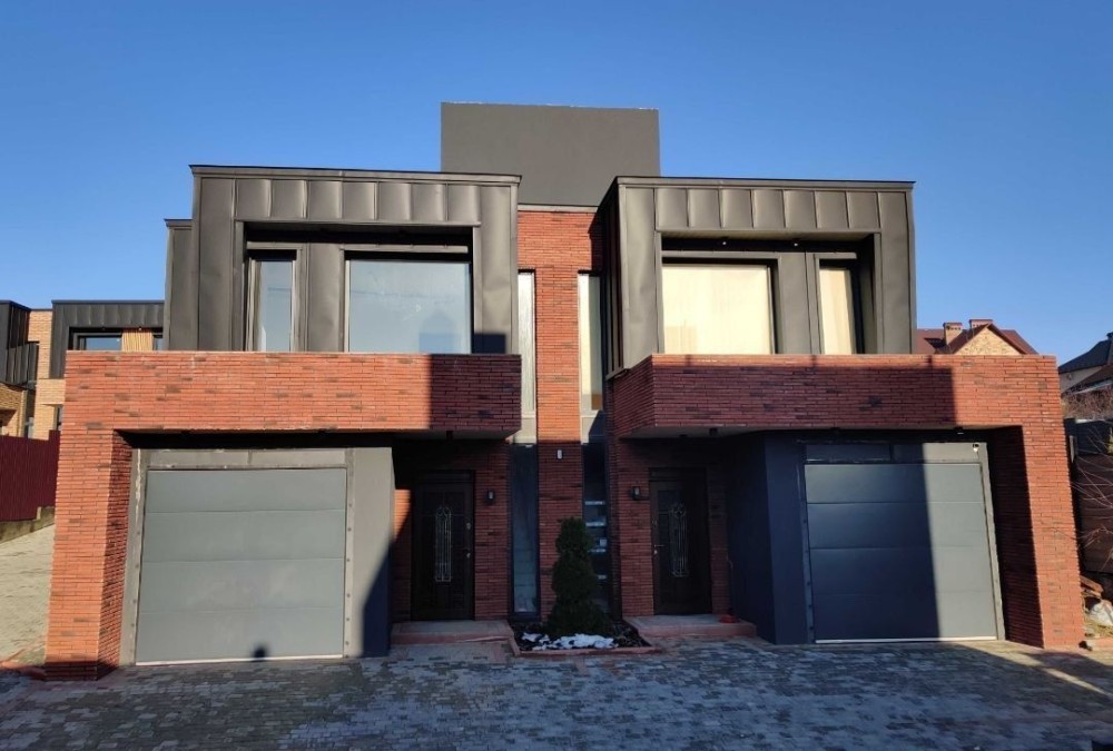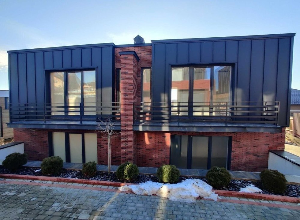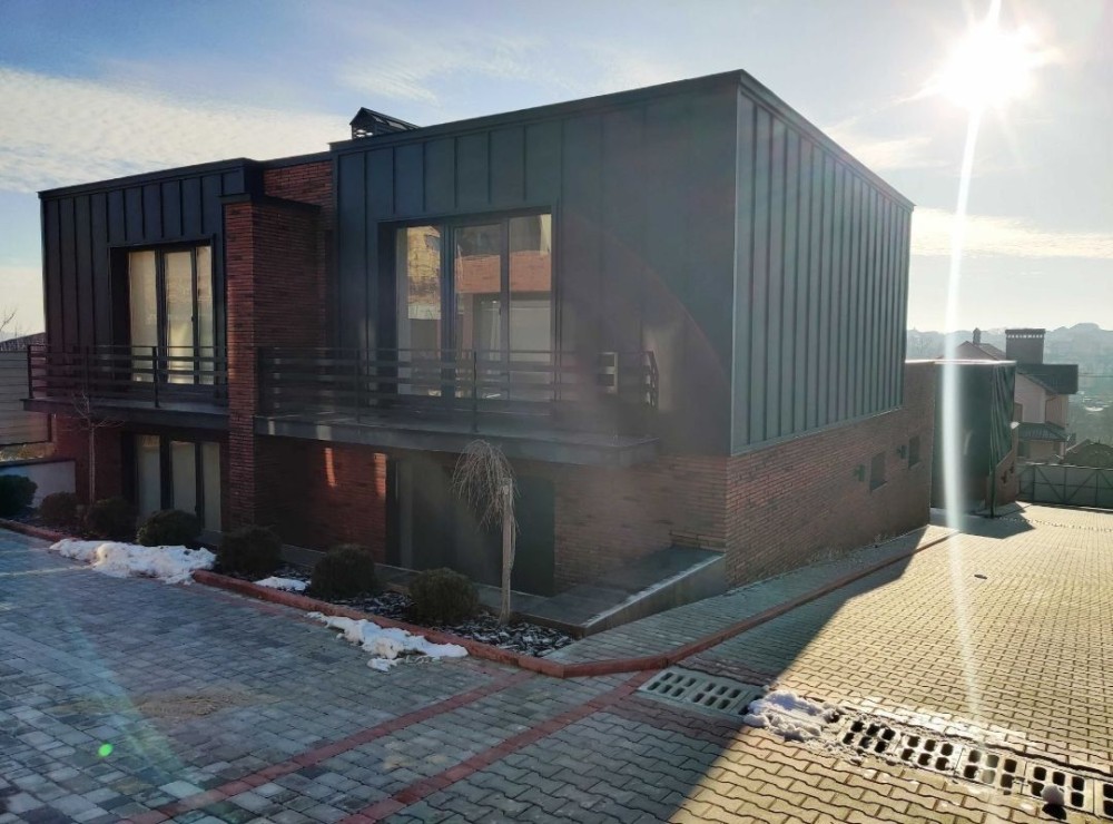 ​Фасад Преміум-Класу: Облицювання з австрійської цегли та естетичних фальцевих деталей європейського виробництва. Утеплення 100 мм (мінеральна вата та пінопласт) гарантує високу енергоефективність.