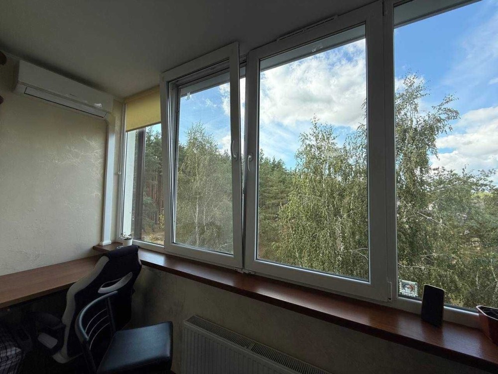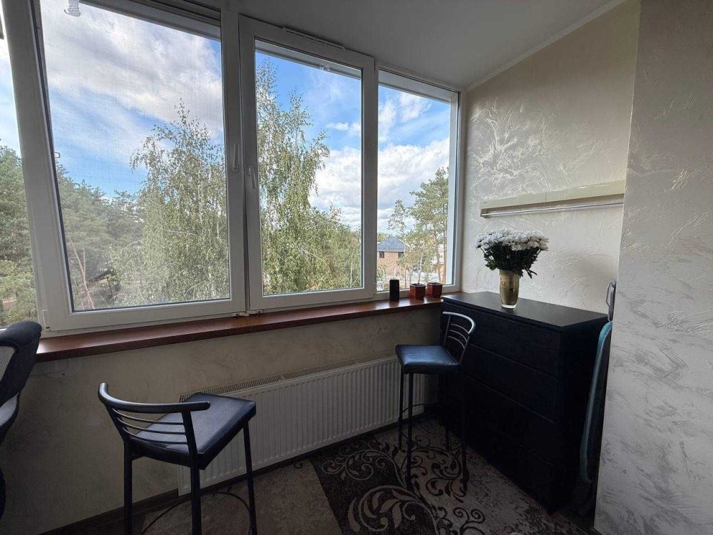 • Лоджія — робоча зона (комп’ютерний стіл, полички, комод), зона відпочинку з барними стільцями біля панорамного вікна та кондиціонером.