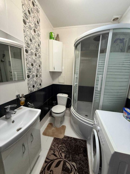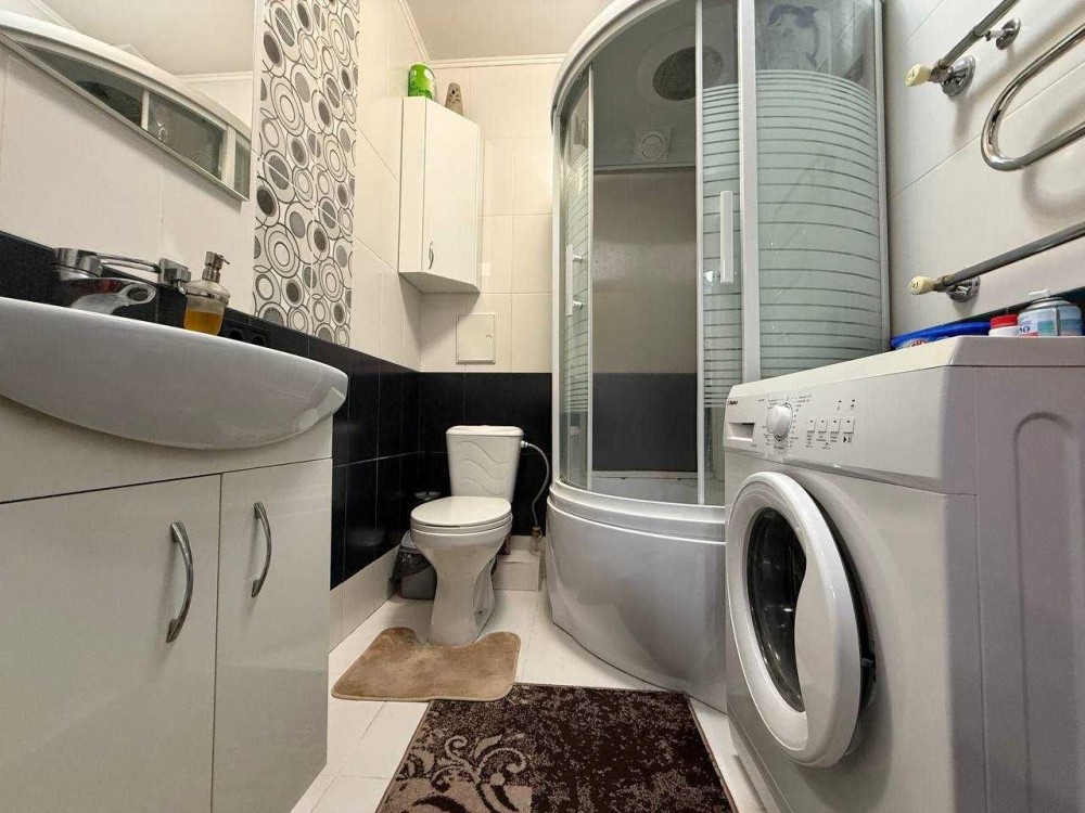• Ванна кімната — душова кабіна, пральна машина, умивальник із тумбою, шафки для речей.