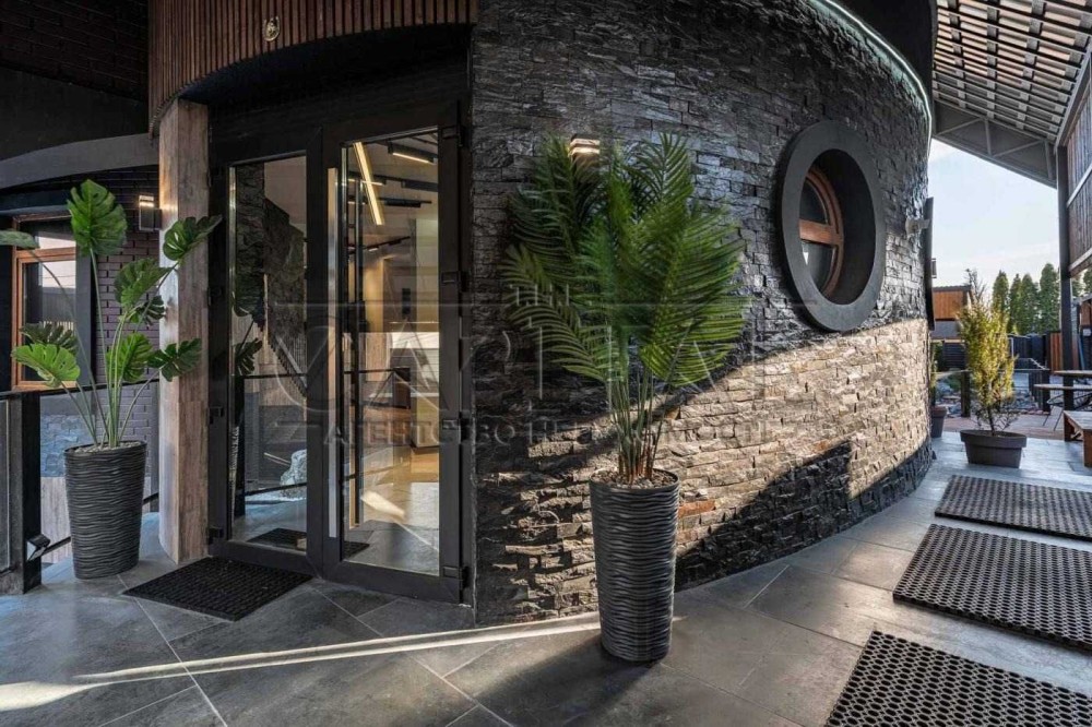 • Архітектура — асиметричний дах, великі панорамні вікна, поєднання дерева, цегли та металу