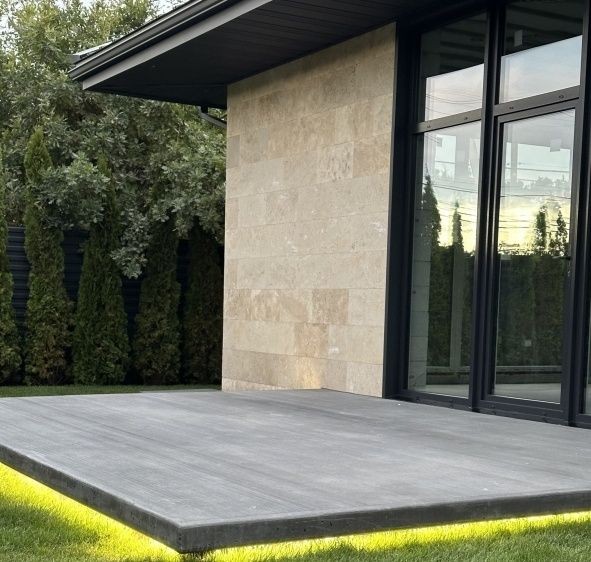 Фасад: натуральний камінь — травертин, сланець, колотий травертин