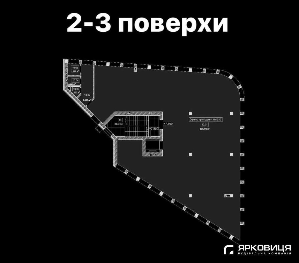 2-3 поверхи-open space, більш ніж 300 м2 кожен поверх