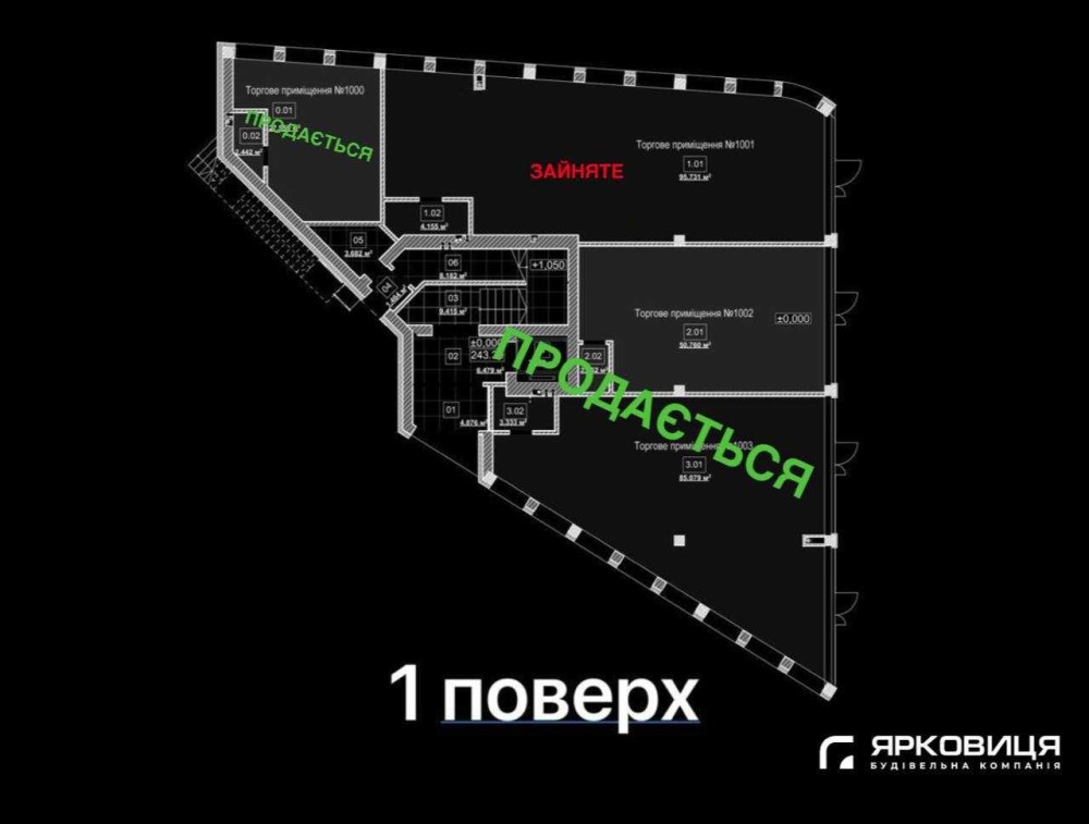 Новий торгово-офісний центр від БК Ярковиця, розташований у діловій частині міста, готовий до ремонту, площею 971м2