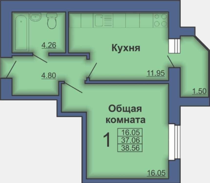 Загальна площа - 41 м кв, кухня - 12 м кв.