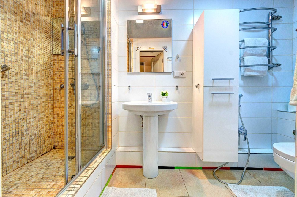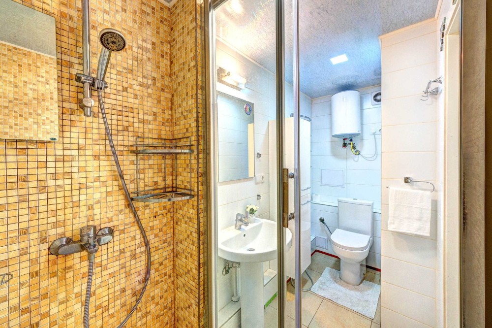 Санузел оборудован компактной душевой кабиной, умывальником, унитазом, бойлером, сушилкой, стиральной машиной и макияжной зоной с зеркалом.
