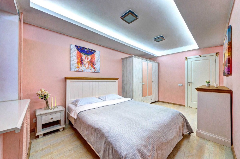 В спальне большая 2х спальная кровать. Интерьер в пастельных тонах. Шкаф-купе и прикроватная тумба.