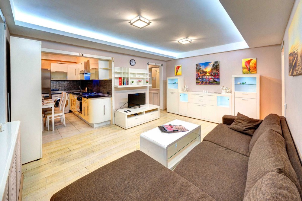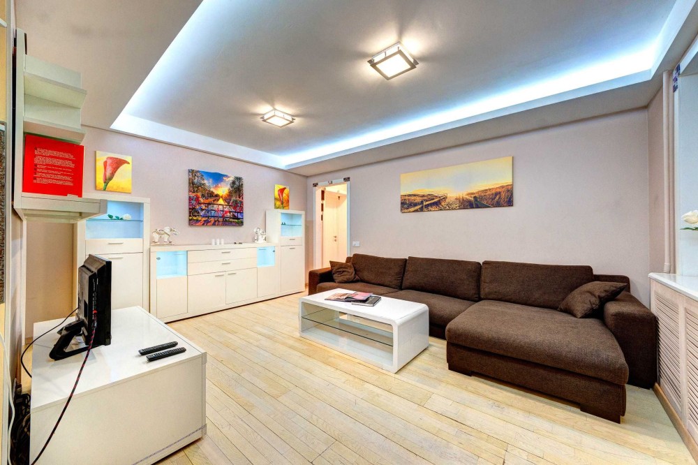 Во второй комнате большой мягкий диван, журнальный столик, плазменный телевизор.