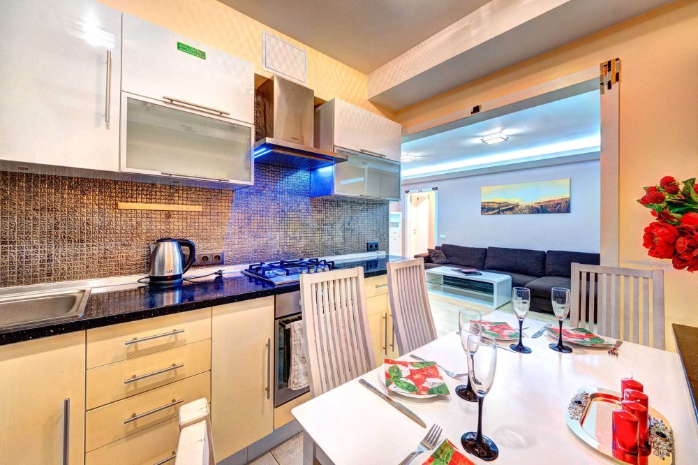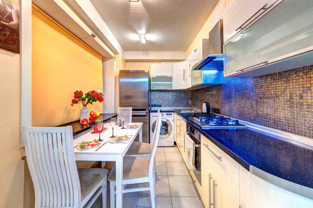 Просторная кухня вмещает СВЧ-печь, варочную поверхность, электрочайник и обеденную зону.