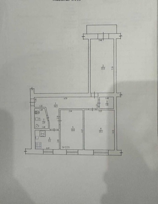 Кімнати роздільні - 10, 13,1 та 13,5 м² - відповідно.